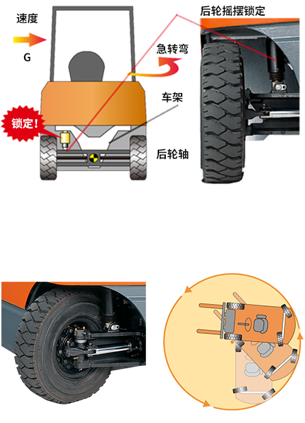 在急转弯以及高举升、高负荷时,通过感应货物的重量、门架的提升高度、横向加速度等车辆行驶信息,必要时即通过锁定油缸来锁定后轮轴。