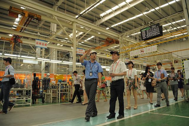 (在工作人员的引导下,来宾兴致盎然地参观了丰田叉车昆山新工厂,与精益生产方式进行零距离接触)
